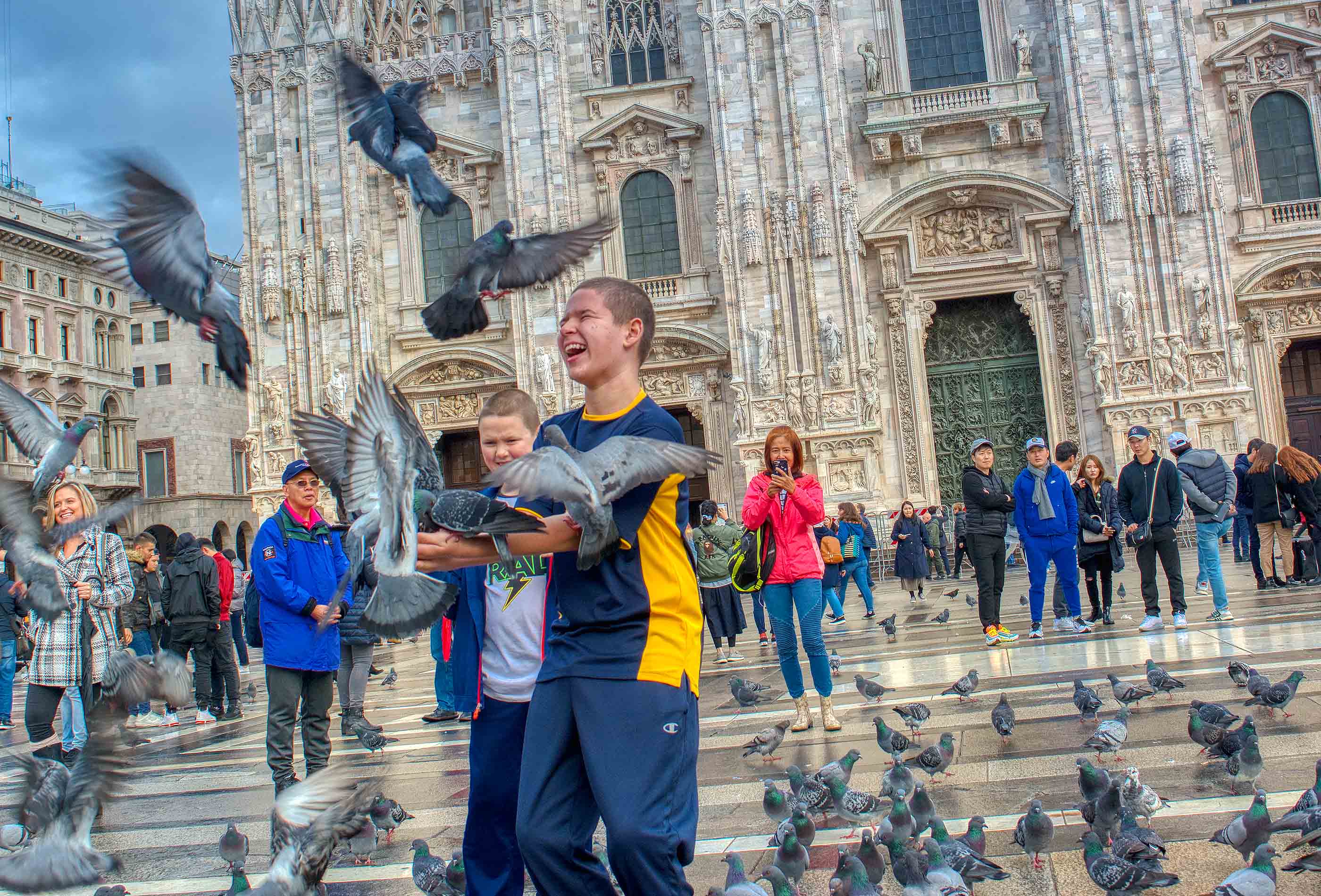 Our first big Italian city to visit. We arrived in the morning and had about 7 hours to explore. It was pouring and we had all our crap. Terri found a luggage storage place a 100 meters away. We hit that and then set out on the metro. Tried to see the Last Supper but couldn’t get in so went on to Duomo to see the cathedral. Hot tourist spot to take pictures. Guys with bird food there to help take pictures with the pigeons then they quickly ask for money. Worth it though and fun.